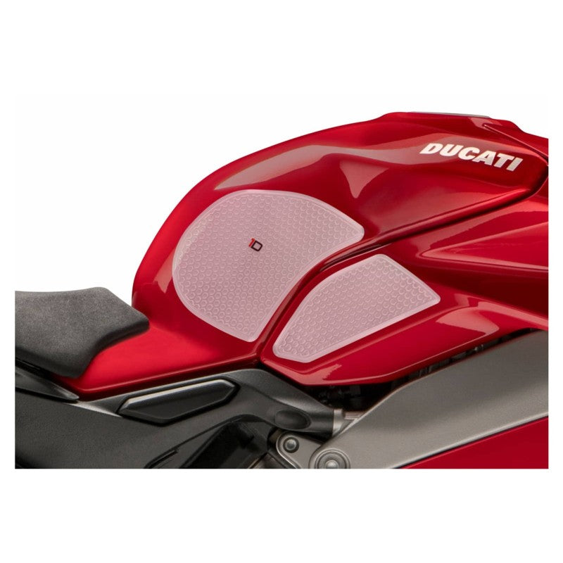 PUIG ADESIVO SERBATOIO SPECIFICO LATERALE DUCATI PANIGALE V4 20-21 TRASPARENTE. Dimensioni (HxL): 168.1x184.8 mm, 182.2x76.2 mm. Materiale: gomma, conferendo alla moto un aspetto unico e sportivo, evitando i graffi in un'area sensibile. Grazie al design Onedesign, questo pezzo conferisce al serbatoio una maggior presa e aumenta il controllo del pilota sulla moto.