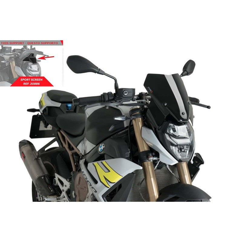 PUIG CUPOLINO NAKED NEW GENERATION SPORT PER BMW S1000 R ANNO 21-24 COLORE NERO. PER LE MOTO SENZA IL SUPPORTO ORIGINALE BMW. Dimensioni (HxL): 290x285 mm, +100 mm sopra la strumentazione. Materiale: MPPA metacrilato alto impatto, spessore 3 mm. Specifico per ogni modello di moto. Per il montaggio non si necessita di modifiche al veicolo. Kit montaggio e istruzioni comprese, nel kit e' presente la chiave ALLEN per il montaggio. Omologato T.U.V.