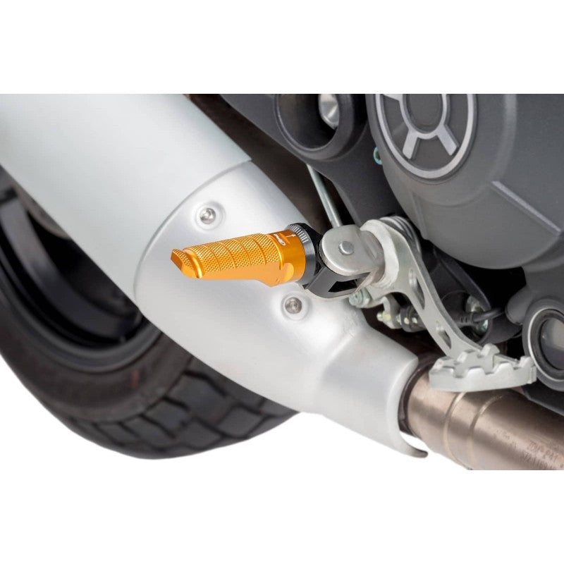 PUIG POGGIAPIEDI MODELLO RACING COLORE ORO. Dimensioni (LxH): 72x27 mm. Peso: 90 gr. Inclinazione regolabile. Venduti in coppia. Omologati T.U.V.